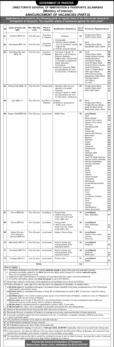Directorate General of Immigration and Passports Jobs 2024 March / April NTS Apply Online
