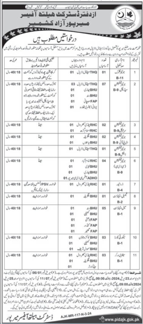 The District Health Department in Mirpur, AJK Pakistan, is seeking applicants for various positions including security guard, clerk, driver, CDC technician, female attendant, medical technician, EPI technician, PSV driver, surgical technician, dental technician, attendant, and sanitary worker.