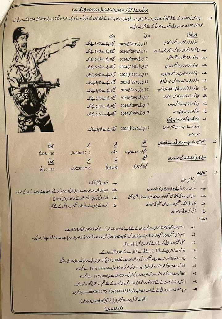 The Pakistan Army’s Frontier Corps is hiring for various positions in Quetta, Washuk, Kech, Panjgur, Chaghi, Lasbela, Awaran, Khuzdar, Turbat, Kalat, Gwadar, and Kharan, Balochistan, Pakistan. Positions include Education Naib Subedar, Sipahi, GD Soldier, EME Sipahi, Clerk, Soldier Clerk, and Nursing Sipahi.