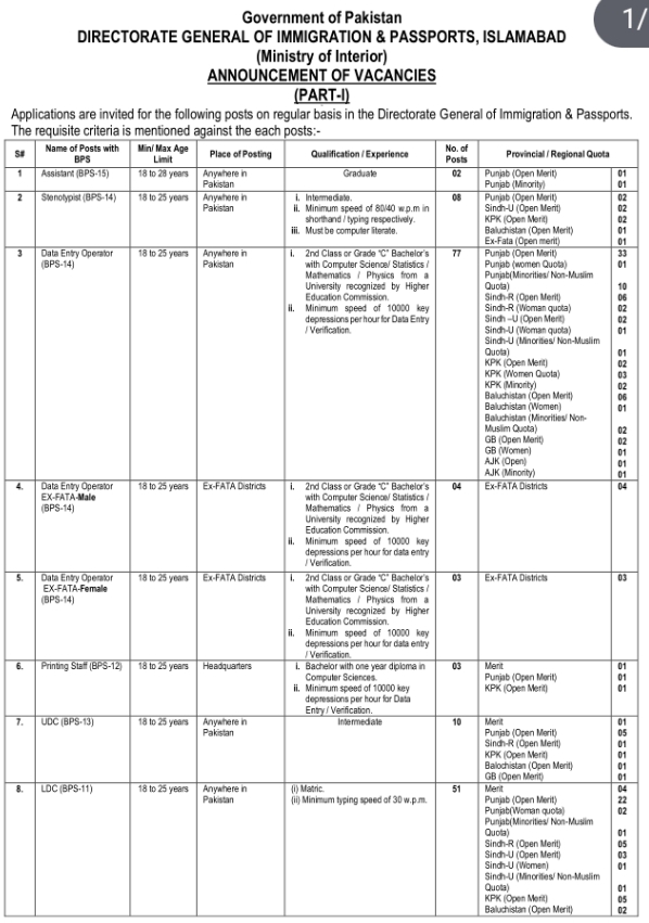 The Ministry of Interior in Islamabad has recently announced new job opportunities through a recent advertisement. They are inviting applications for various positions on a regular basis at the Directorate General of Immigration & Passports. Both male and female candidates are encouraged to apply for these government jobs in Islamabad. Interested candidates can find the details below and apply accordingly.
