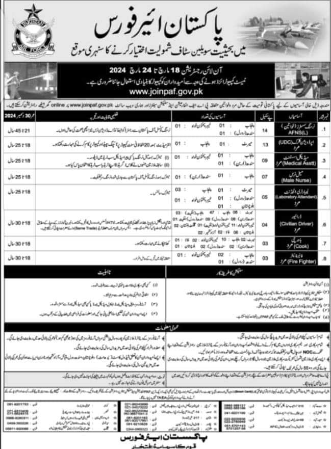 PAF invites applications for civilian positions in March 2024, as advertised in the latest Nawaiwaqt Newspaper. Suitable candidates meeting the criteria are encouraged to apply for various roles including nursing, clerical, driving, and clinical positions across multiple branches of the Pakistan Air Force. Both male and female candidates are eligible to apply for these government jobs in Islamabad.