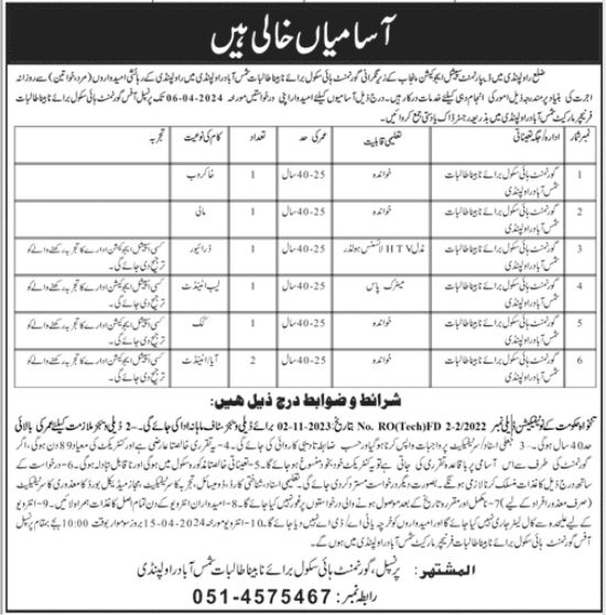 The Government High School for the Blind Girls in Shamsabad, under the Special Education Department Rawalpindi, Punjab, Pakistan, has announced job vacancies for various positions. The department is inviting applications from eligible candidates to fill roles such as driver, sweeper, lab attendant, mali, cook, HTV driver, attendant, and aya. The advertisement for these positions was published in the daily Jang Newspaper on March 30, 2024.