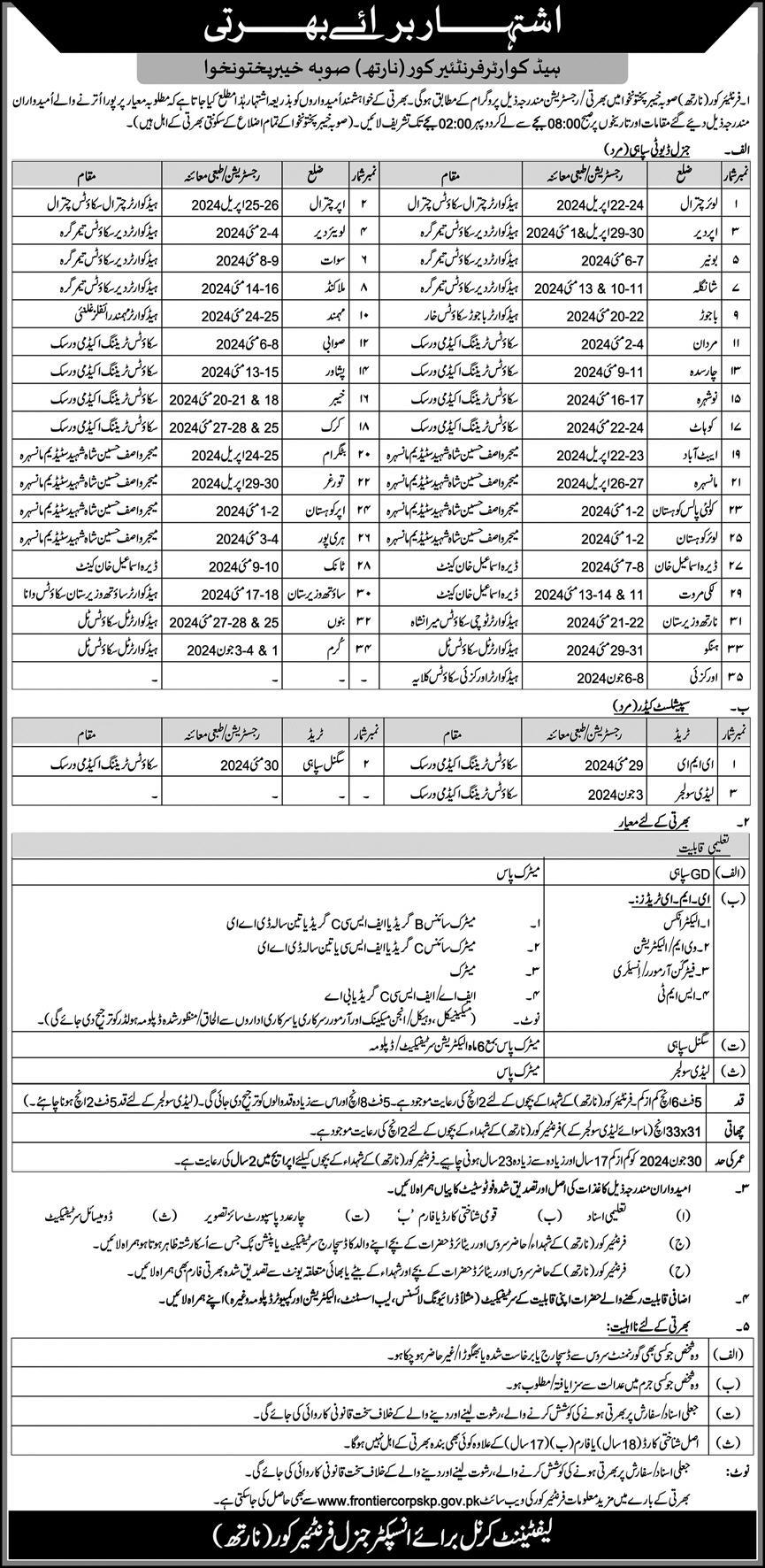 The Frontier Core, a vital component of the Pakistan Army, has announced job openings in various regions including Peshawar, Dera Ismail Khan, Kohat, Abbottabad, Bannu, Charsadda, Mohmand, Swabi, Buner, Hangu, Malakand, Lakki Marwat, Swat, Upper Dir, Tank, Khyber, Mardan, Kurram, Lower Dir, Bajaur, Mansehra, Kharian, Torghar, Shangla, Kohistan, Battagram, Chitral, and Karak in Khyber Pakhtunkhwa (KPK), Pakistan.