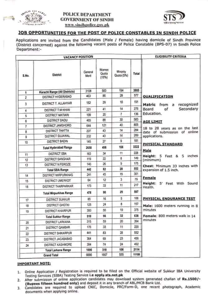 New job openings for security positions in the Sindh Police are available in various cities including Karachi, Badin, Thatta, Benazirabad, Hyderabad, Larkana, Khairpur, Qambar Shahdadkot, Sujawal, Jamshoro, Ghotki, and Tharparkar in Sindh, Pakistan.