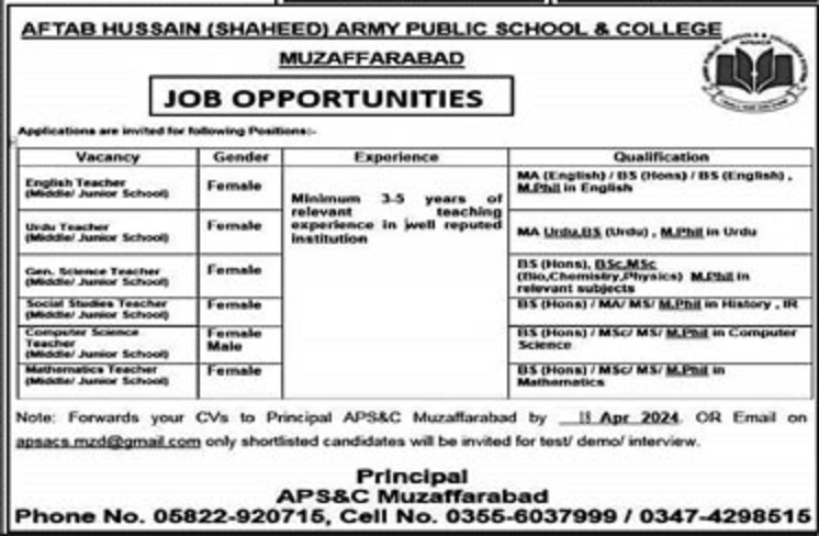 Army Public School & College in Muzaffarabad, AJK, Pakistan is looking for Urdu, General Science, English, Maths, Social Studies, and Computer Science teachers.