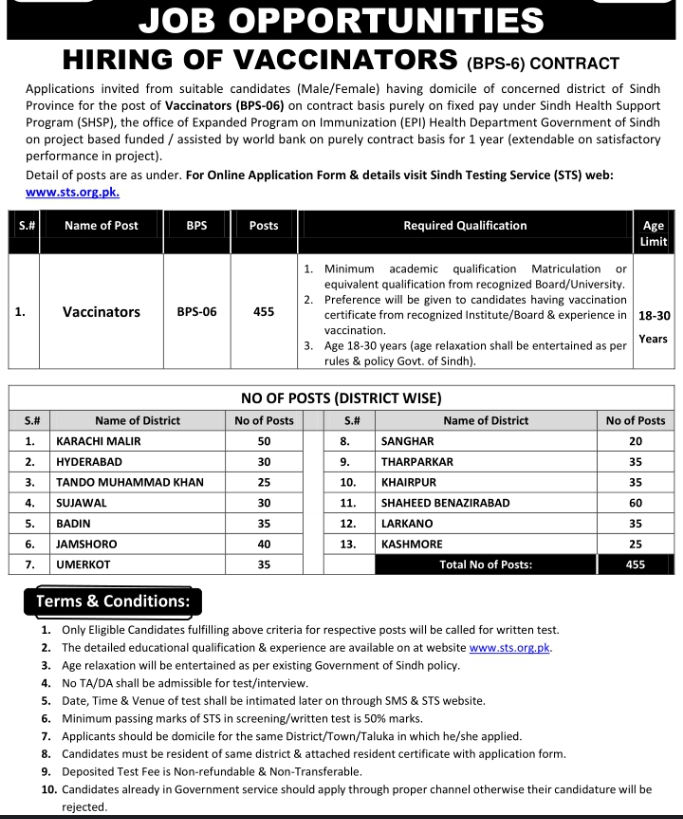 The Health Department in Karachi, Sindh, Pakistan, has announced multiple vacant positions, including that of vaccinator, through an advertisement published in the daily Kawish Newspaper on April 1, 2024. This recruitment drive aims to fill essential roles within the department, with preference given to candidates holding Bachelor’s degrees or equivalent educational qualifications.
